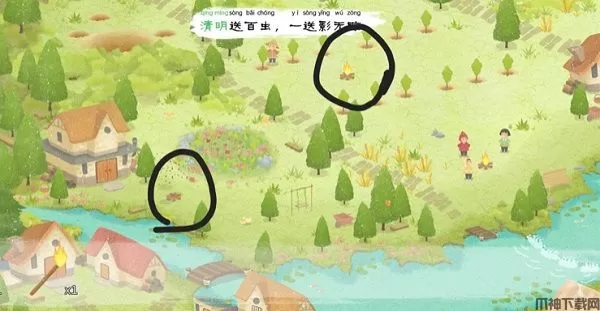 8、点小孩手里的木棍(有点小,放大看),把木棍放进河对岸的火里,再把木棍给小孩(还有三处火堆场所如图)然后让我们视线归来右上角的茶伯伯这里。