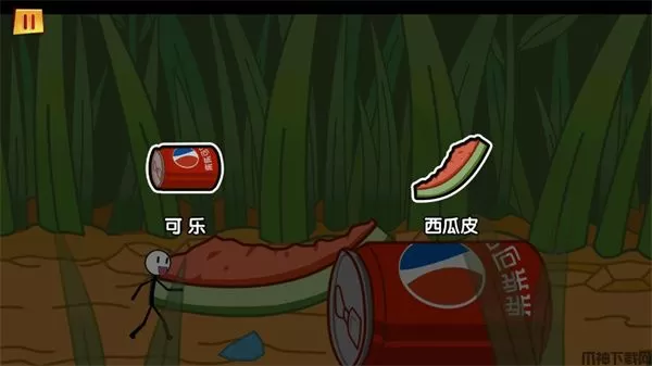 9、小虫子在这里乞讨,说自己已经好多天没吃饭了,这时火柴人在一个草丛中发现有一瓶可乐和西瓜,这里选择“西瓜”选可乐会被他的气体喷飞;