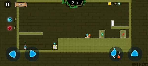 4、除了道具之外,该游戏还提供了很多种类型的机关措施,例如火娃娃想要到达那扇传送门的话需要冰娃娃去按照机关按钮才能将道具门打开,方能通关。