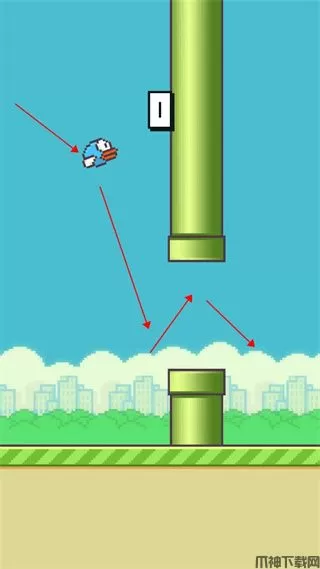 小鸟的跳跃是个锯齿状,靠点击屏幕来获得上飞的力量。你知道路线是锯齿状的,那么你对小鸟的下一步就有了预期和判断,这样就不至于掉在地上或者是撞向柱子。要想过更多关卡,就必须在上下柱子之间起跳,起跳是需要与下面柱子隔一定距离。