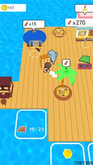 1、首先玩家需要搭建木筏,这样才能有足够的场地建设各种设施,其中有各种不同风格的木筏,有点免费有的是需要用金币换取的哦!