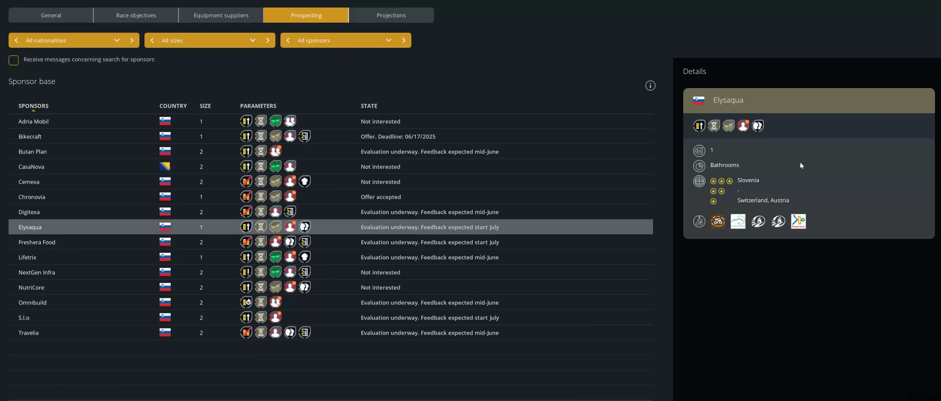 您与赞助商保持着持续的联系,您需要为团队的未来做出最佳选择。在 Pro Cycling Manager 25 中,随着赛季的进展,您的联系人网络不断扩大,赞助商会主动找上门来。如果您正在积极寻找赞助商,赛季期间发现的赞助商将能够联系您并表达对您团队的兴趣。