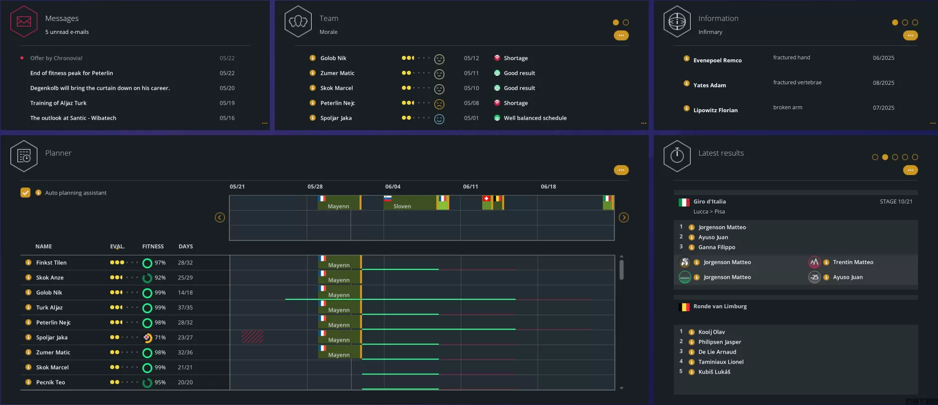 3、玩家可以查看自己车队的情况,可以在屏幕左上角看见界内的各种通知,如赛事开始,选手退役等等,还有显示车队队员的状态,积极备战还是消极度日,以及部分队员受伤情况等等,一目了然。