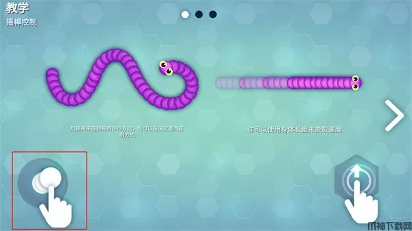 2、游戏中玩家需要通过游戏左下角的摇杆来控制小蛇来进行移动;