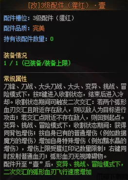 三级配件:新增E技能,刀战模式下可以让远程飞刃有小范围的自瞄,变异冒险模式下则可以提升自身的增伤。