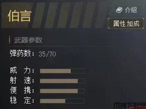 伯言前置弹夹35,备弹75。威力,爆头一枪,胸部两枪。射速40发/5秒,换弹2秒。