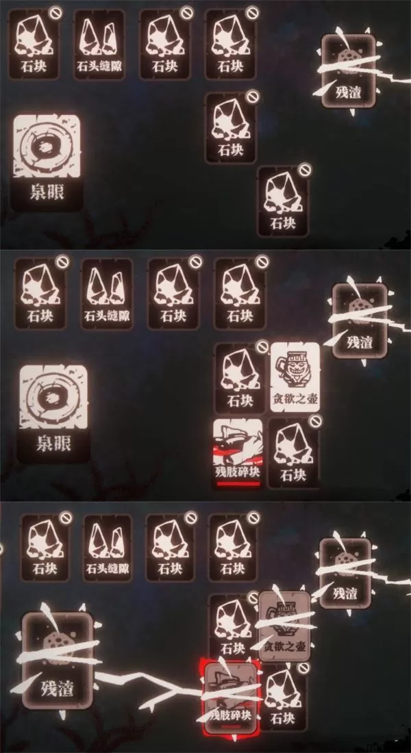本作的卡牌蔓延需要用到两种基本资源:血液和水分。血液主要通过连接各种生物来获得,可获得的总量相对充足,而水分获取的方式非常少,仅有泉眼一种能直接产出水分的设施,特别是在第三章和第四章的雪天会大大增加用水量,因此在探索过程中一定要节约用水,有时候宁可多放一张卡牌也要减少用水。