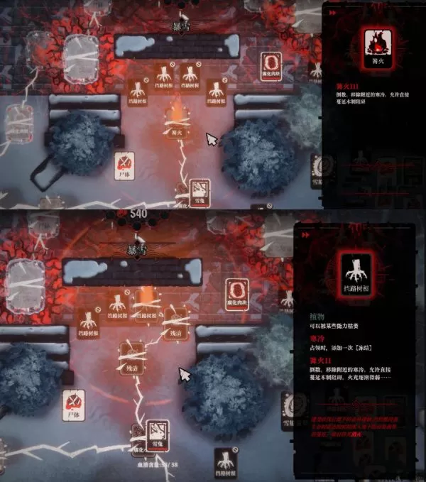 篝火有两个作用,第一个是能防止范围内的卡牌冻结;第二个是能传递火种将挡路树根烧掉,默认情况下只能传递两次,也就是烧两个树根,利用这个特性可以节省一些酸土。