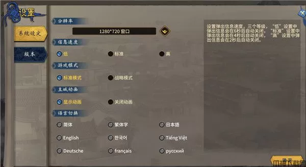 4、点击设置,玩家可以自定义修改游戏的分辨率、语言、显示动画、游戏模式等参数;