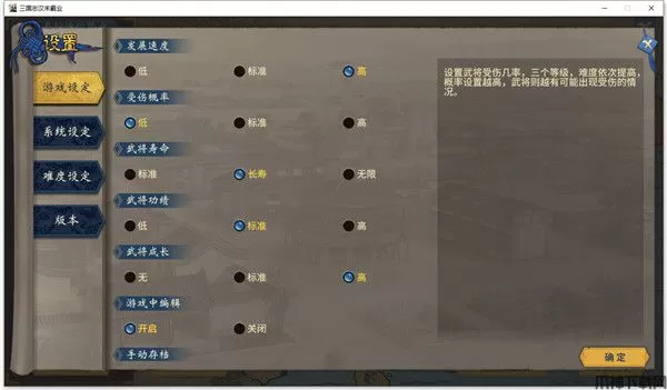 7、选择其中一种你想要扮演的势力后,设置好自己的游戏设定,比如发展速度、受伤概率、武将成长、武将功绩、武将成长等参数即可开始游戏。