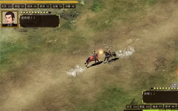 突击:骑兵技能,释放后可以一条直线上最多两个单位造成伤害,只可以在平坦地带释放,有几率可触发混乱以及单挑。