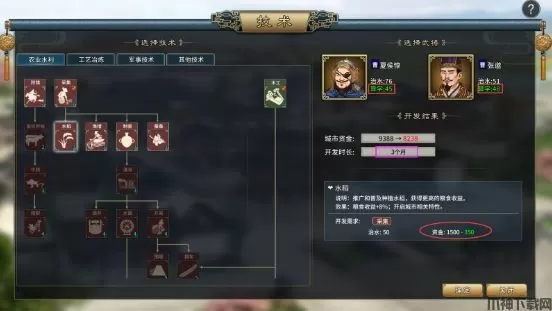 4:开发对应科技,系统会自动筛选出符合条件的武将,如果有多个,你一定注意,【算学】越高的武将,越能帮你省钱,选择两个算学最高的来研究就是。