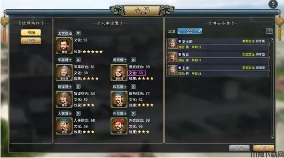 太学就是玩家的子女培养基地。所有年满5岁,未满16岁的武将子女都会在此学习。年满16岁的话,就自动太学中撤出。然后第二个月入职仕官。