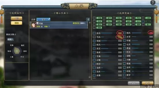【特训】就是额外的追加训练,效果显著。每年系统会根据城市规模追加3-6次特训次数不等,另外“名士“来访也会有机率追加次数。玩家可以选择将特训的次数用于子女的任一属性或者兵法上面进行突破。