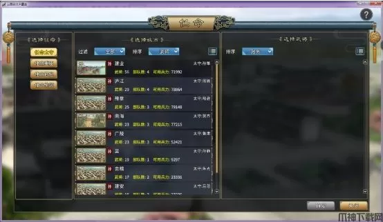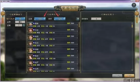 【移动】就是武将调动,一般都是将后方的优秀武将往前方战场城市调动,选择一座城池后,通过第二图的筛选,将某个城池的某个武将移动到想去的那个城池。注意【太守】是不能进行移动的,如需要,先要到【任命】里更换太守。前期武将数量不多时,把优秀武将平均分配到每个城,任命成太守,提高分城的政务效率。