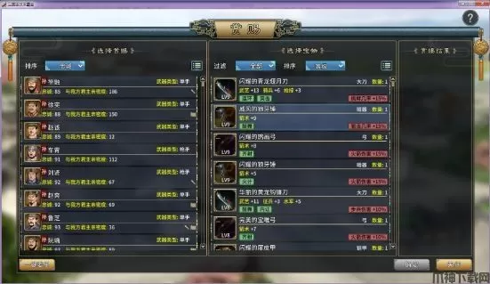赏赐是有效提高武将能力的方法,同时对于提高武将的忠诚度有很大帮助。现在电脑AI有笼络我方武将的功能,玩家需要时时刻刻注意自己武将的忠诚度,以防己方武将投靠敌军。赏赐武将武器时,需要根据武将的【武器类型】来赏赐,不然属性是没有效果的。右侧是可以筛选物品的,比如书,药材,酒等。赏赐结果会显示武将忠诚度的增加,属性增加。