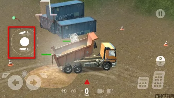 9、此时会出现倾倒泥土的轮盘,我们可以自由操作上下倾倒卡车斗子。