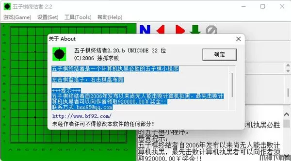 五子棋终结者是一款计算机执黑必胜的五子棋小程序,这款小程序搜索完了五子棋的全部空间,建立了完整执黑必胜谱。它自2006年发布以来,从来没有人击败过计算机执黑。本次小编为你带来的是这款软件的2.20.b版本,也是官方最新版。在这个版本中,玩家可以执黑子来和开放了思考引擎的计算机进行对战,用户可以通过这款软件学习五子棋执黑的下法,让你以五子棋轻松击败你的小伙伴。同时,新版本的引擎可配置,引擎的棋力与思考时间正相关,解决了非中文系统中的界面显示乱码、多开声音问题,开放了思考引擎的执白功能,增加了输入棋谱功能。当然这个最新款还是终结者,只要计算机执黑还是必胜。如果有兴趣可以尝试挑战一下!!