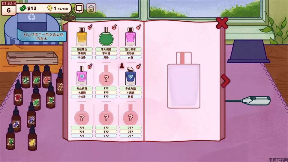 先讲讲经营部分。一款香水上面有适用人群、味道倾向、使用场合,然后还会标记出配料表,进店的顾客会按照这四个方向去提出一定的需求,我们则是要根据这些需求选择适合的香水,当然也会有直接点名要香水名字的,这个就省事多了,但我们一次摆出的香水有限,对于那种不太赚钱的香水品牌,直接不管就好。