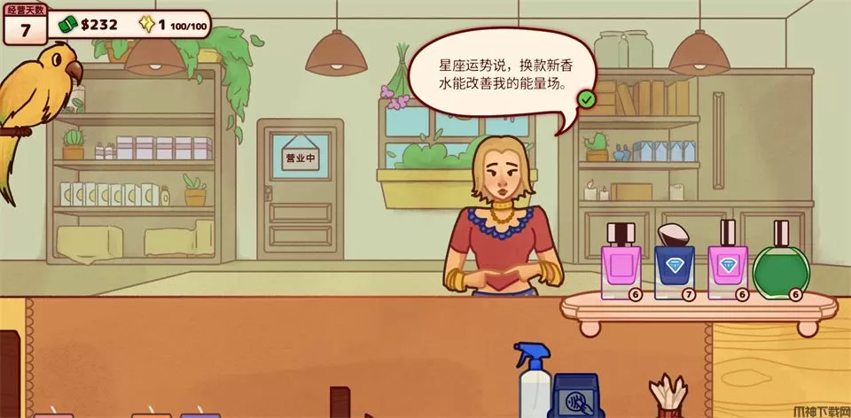 有些客人会先选择一些香水试试味道,我们要用到试纸这个材料,把香水喷洒在上面,他们满意的话会继续购买。有时会有伪装成人类的臭鼬,必须拿清洁剂驱赶它们,否则会把顾客逼走;还有一些花花公子喜欢偷香水使用,要及时让我们养的小鸟啄他们,不然香水的数量会急剧下降。以上这些内容如果在经典模式下会降低客人的耐心,如果担心后面压力大的话,还是推荐游玩休闲模式,不会有耐心值这个设定。
