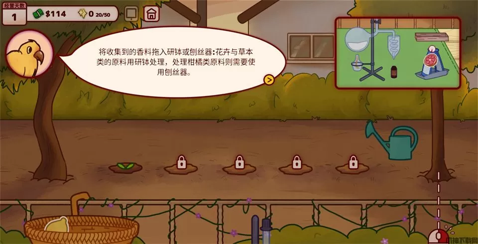 然后是材料方面,我们调配香水的材料有三个来源,分别是花园种植、鸭马逊网购和关店之前商人过来售卖,前两种有所重叠,可以帮忙填补急用材料不足的情况,但是第三种包括雪松在内的材料只能通过商人购买,自己无法种植,所以需要留出一部分资金用在这里。花园材料分为种植品和果树,种植品长成需要一定的时间,果树则是会随机结果,运气不好会卡你一个材料好几天。