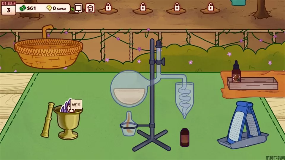 收集到材料后,可以用工具将它们磨成粉状,用小瓶装起来,回到工作室后,拿出我们的烧瓶等化学用具,按照图鉴书将它们混在一起调配。这游戏有个不错的优点,那就是失败的材料全部奉还,不用担心误加了一些东西或者少放了一滴材料导致我们满盘皆属的情况。放水、控温、搅拌这三个部分都有小游戏可以玩,难度不高,只要没太大差错,最后都是三星香水。有些配方需要开店的时候遇到对应的顾客才能解锁,而且这类香水会卡住我们的店铺声望等级,因此遇到这类的香水一定要优先制作。