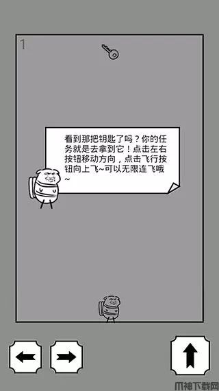 2、看到那把钥匙了吗?你的任务就是去拿到它!点击左右按钮移动方向,点击飞行按钮向上飞,可以一直连飞哦。