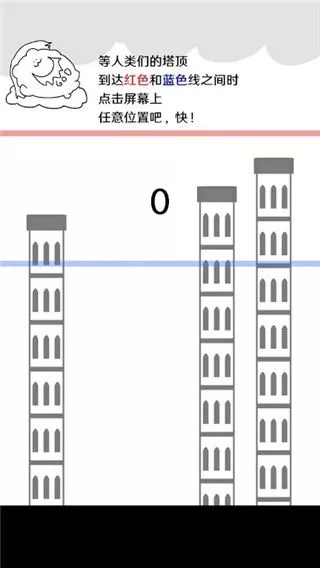 破坏巴别塔最新版是由SleepingMuseum开发的一款有趣的休闲益智类游戏。游戏的整体画风清晰简单,在游戏体验上,玩家在游戏中需要通过落雷来击毁房屋,随着塔的上涨你则需要在蓝色线和红色线之间将其消除,而只有当塔顶触碰红色线条之时才能获得最高的积分