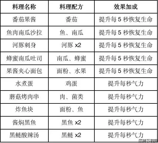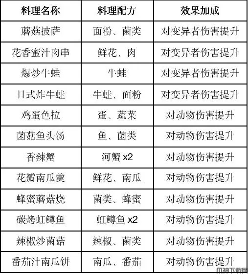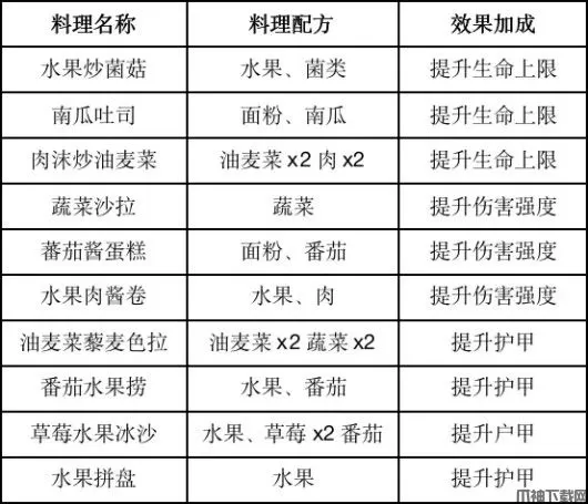 食谱分:共七种,分别为:弱辐射伤害、提升血量、提升伤害、伤害减免、回复饥饿、提升护甲、特殊料理等,具体效果如下。