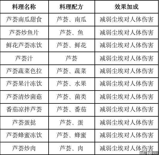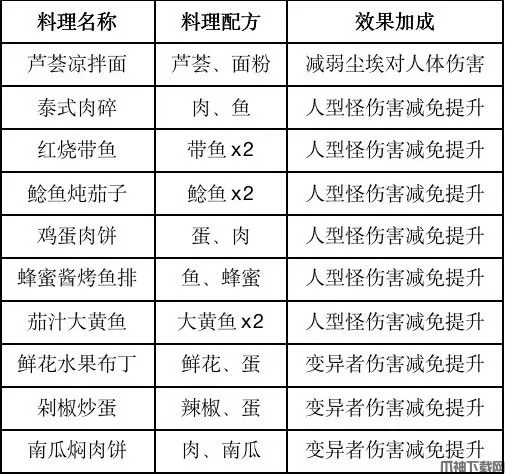 伤害减免提升食谱分成三类:减弱尘埃对人体的危害、人型怪伤害减免提升,污染者伤害减免提升。