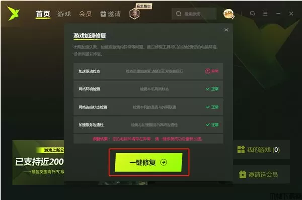 1、若出现加速失败、加速后游戏内异常等问题,通过修改工具可以自动检查您的电脑环境,诊断问题并修改