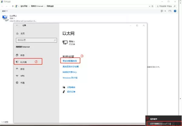 点击任务栏右下角的网络图标,选择“网络和Internet设置”---“以太网”---“更改适配器选项”