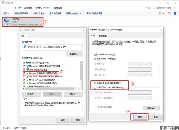 找到并双击“Internet协议版本4 (TCP/IPv4)”(IPv6网络,选择“Internet协议版本6 (TCP/IPv6)”)在弹出的窗口中,选择“自动获得DNS服务器地址”选项后点击确定