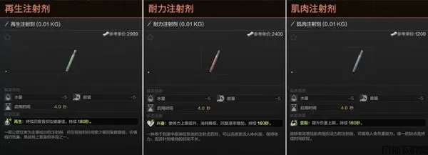 另外每种药剂还会分为注射剂和强度剂。强度剂是注射剂的升级版,消耗水量和能量更少、持续时间更长,当然价格也更贵。