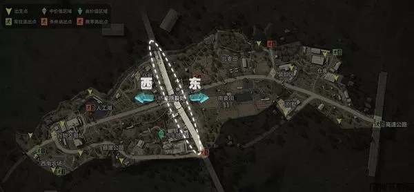 如上图所示,农场中部断裂的桥梁将农场分为东西两部分。玩家在战术行动中进入时的出生点和常驻撤离点分布在地图的东西两侧。一般来说,如果出生点在西侧,那么默认的撤离点就会在东侧,反之同理。所以先锋们不管出生在哪里,行进路线基本为“从左到右”或“从右到左”。地图中战利品价值比较高的区域有:谷物交易站、装卸区、别墅、马厩、汽车旅馆。除此之外,北麦田露天堆放处、南麦田小屋也有一些武器箱和抽屉可以搜索。接下来我将以从西到东的顺序,依次向先锋们介绍主要资源点物资分布情况。