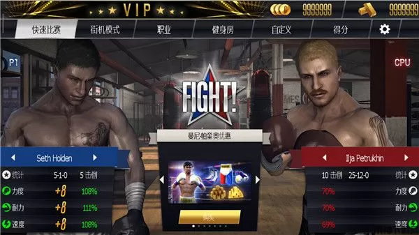 3、点击快速比赛,有木有看到对手的属性才60?速度击倒对手,继续下一场,打完四场比赛后,去训练房马上完成小游戏训练,三围在70以前,有钱就直接买属性,只要不参加竞标赛,属性可以直接刷满