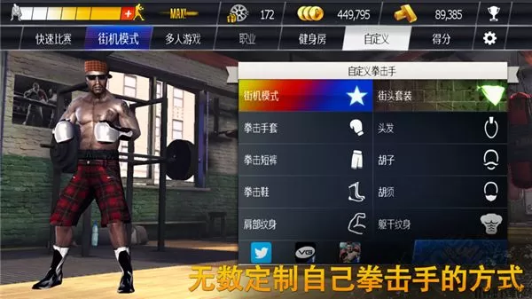 3、在游戏模式方面,除了快速模式和多人对战模式,还有一个完整的生涯模式允许玩家创建自己的拳手来进行比赛,其中还可以选择中国国籍,也可以在更衣室中对角色衣饰、纹身进行自定义,打造自己的“霍利菲尔德”,道具的购买需要花费不少金钱