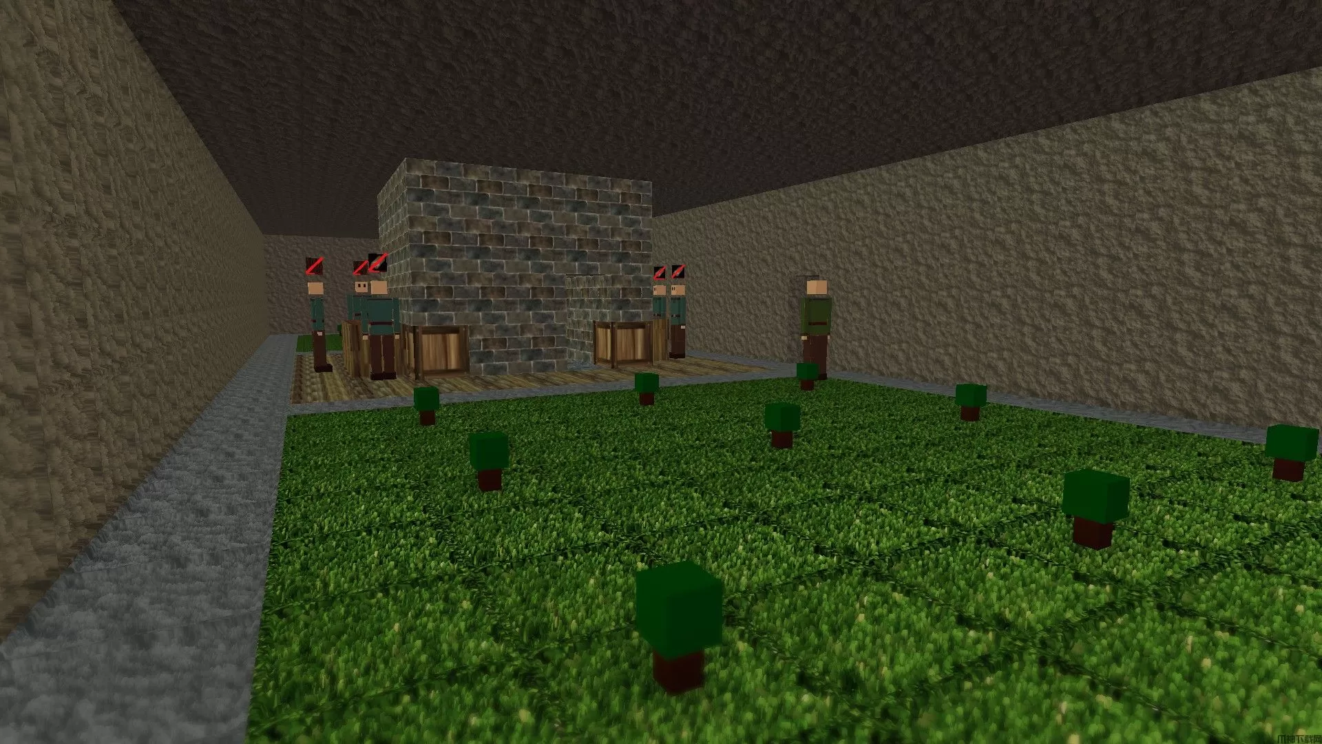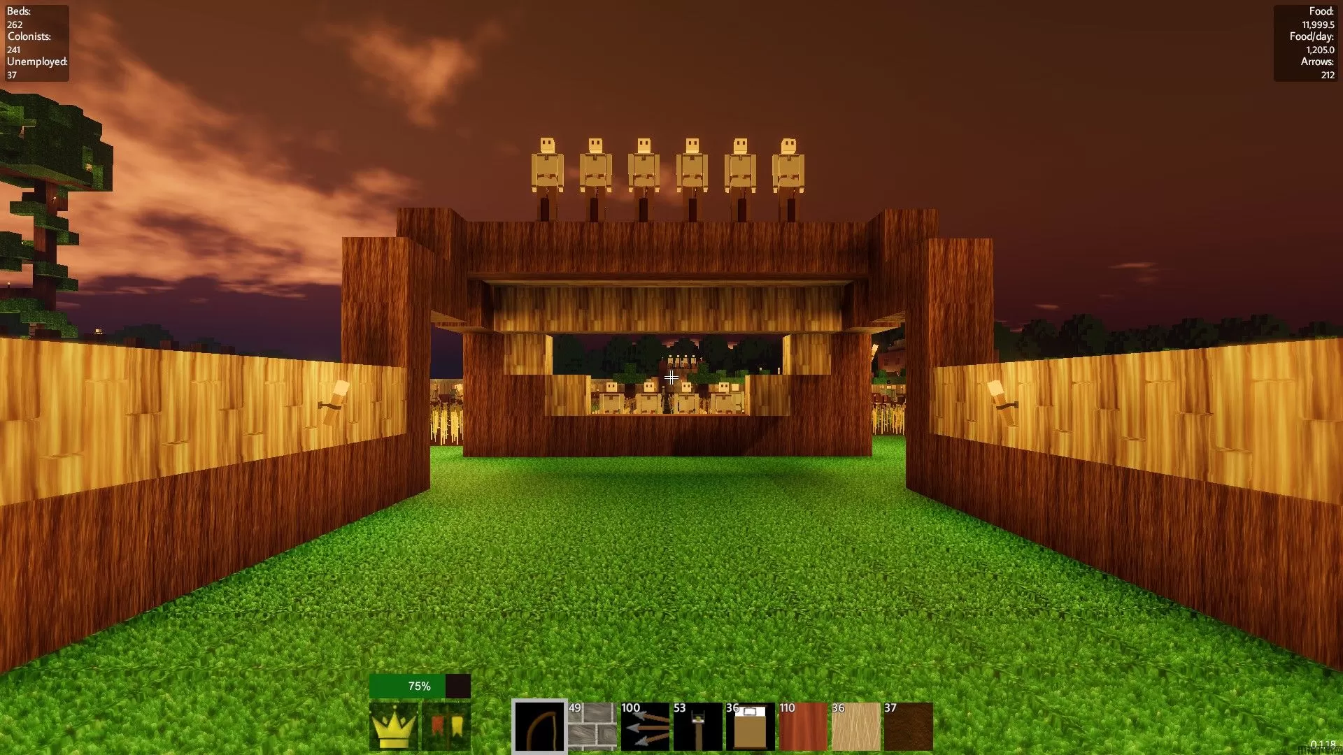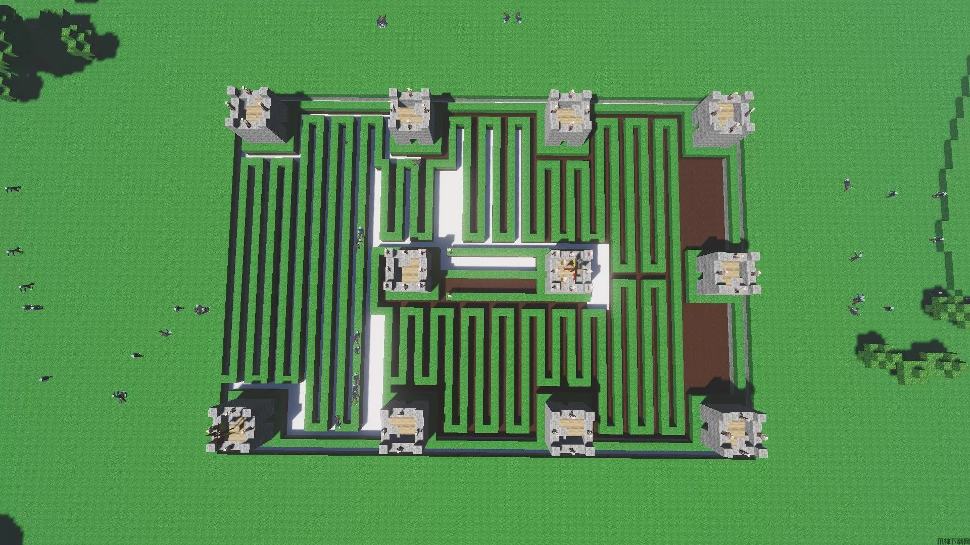 由于我们把所有生产设施都建在了地下,所以你只需要保护好地下网络的入口,因为僵尸不会在里面生成。我发现最好的办法是建造11座塔,其中9座呈3x3排列,另外3座分别建在入口两侧,像尖刺一样。然后你可以在塔的两侧挖沟,形成一条一格宽的小路,引导僵尸沿着这条细长的路径绕过所有弓箭手,最终进入你的基地。不过,到那时,它们应该已经被塔里的弓箭手全部消灭了。
