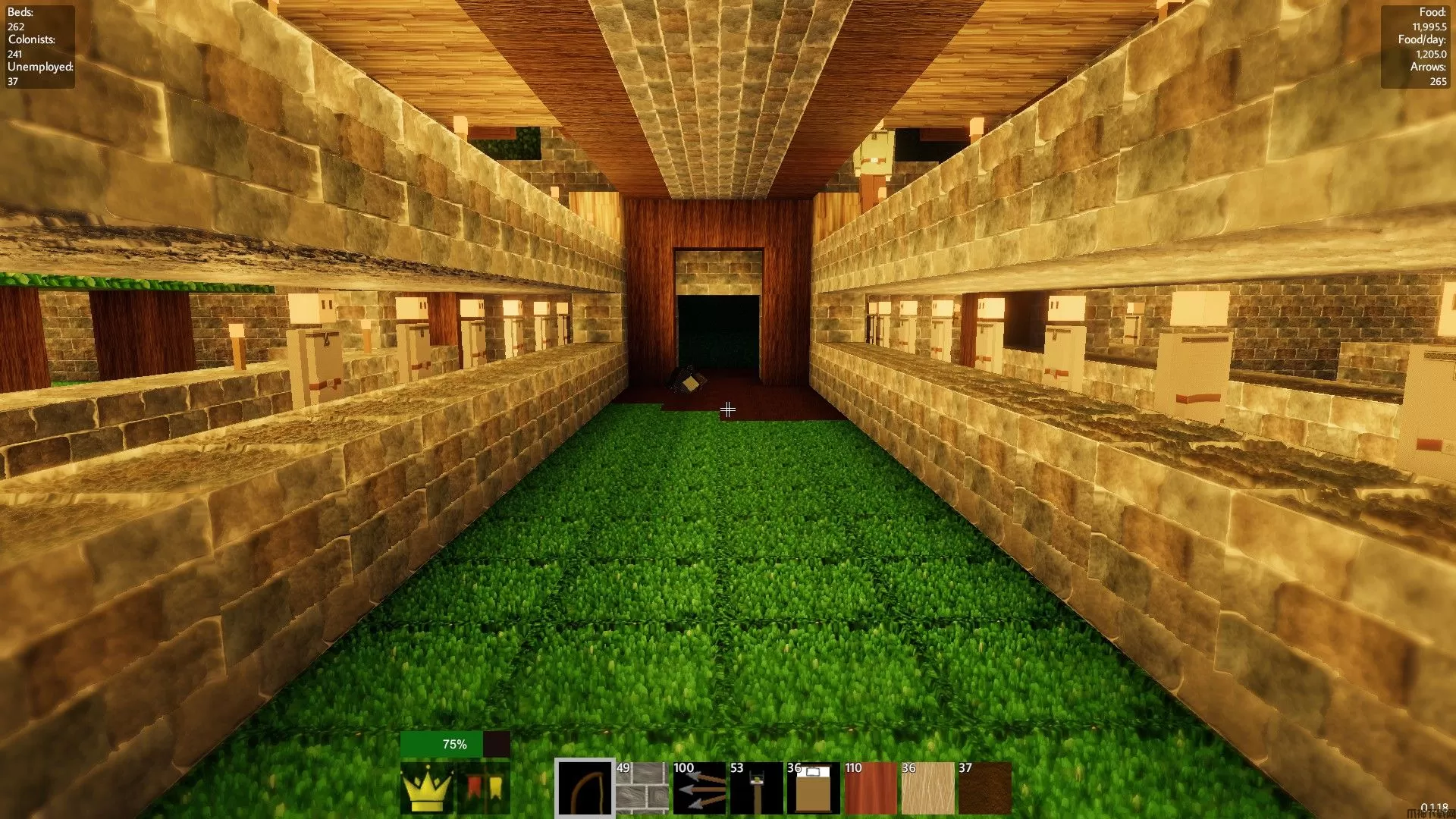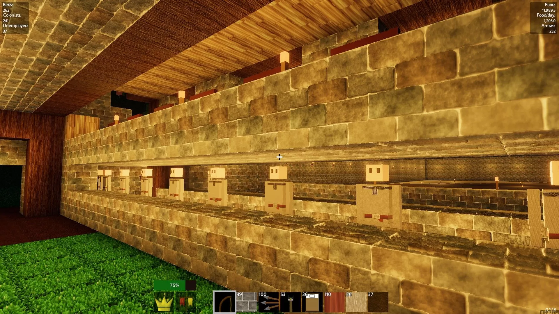 卧铺地堡应该建在最底层,远离采矿区。这些地堡应该是5格宽的隧道,我通常会挖到50格深,两侧都摆满床铺,中间留出一格宽的通道供殖民者走到床铺旁。