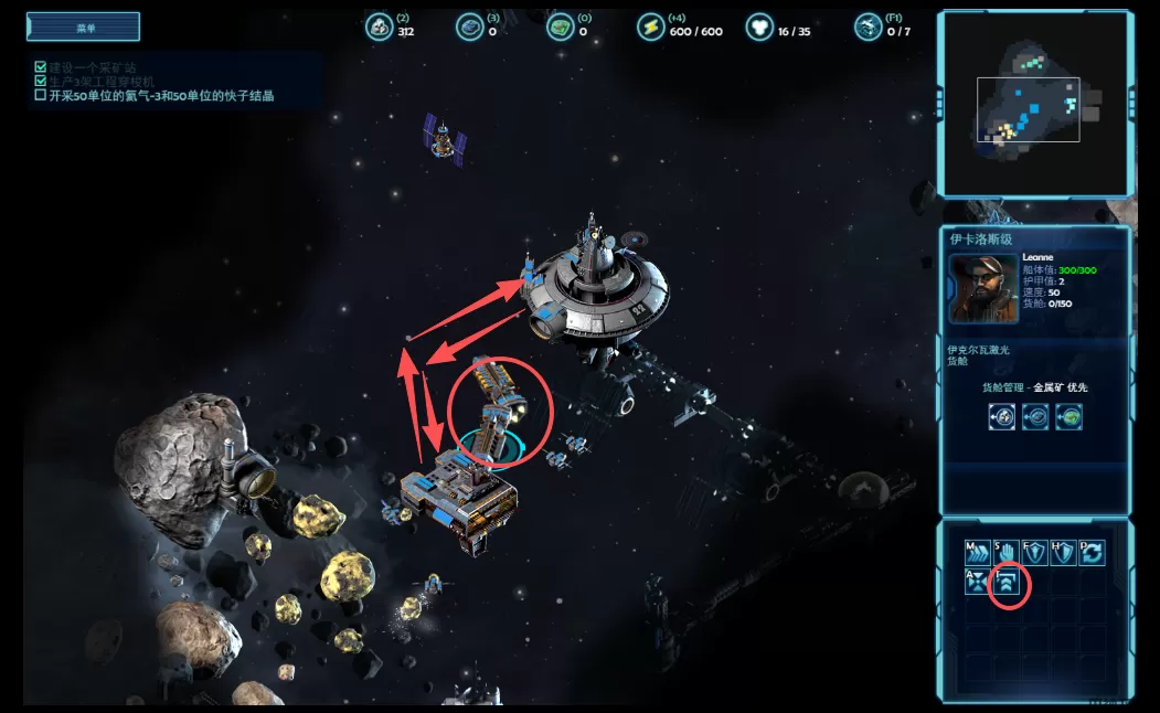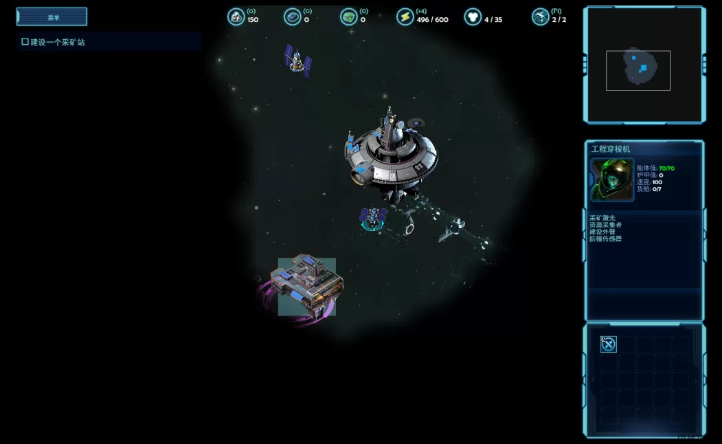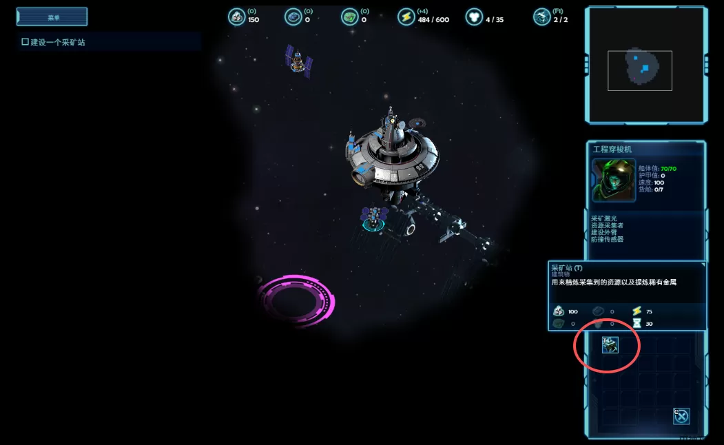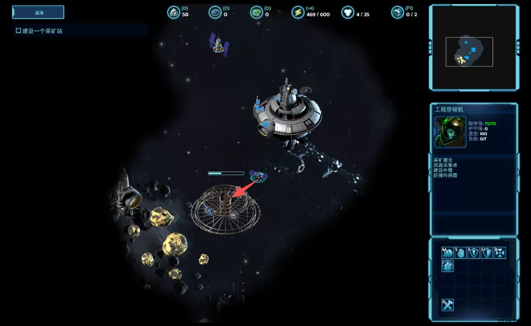 1、游戏开始,可以利用工程穿梭机来建造“采矿站”,选择工程机,点击快捷键“B”,或者在屏幕右侧板块的一系列指令选择也可。