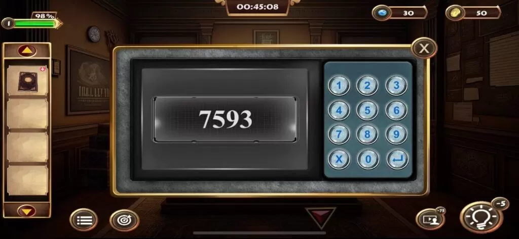 完成后,点击位于绿色门旁右侧墙上的安全输入面板。在此处输入4位密码“7593”。