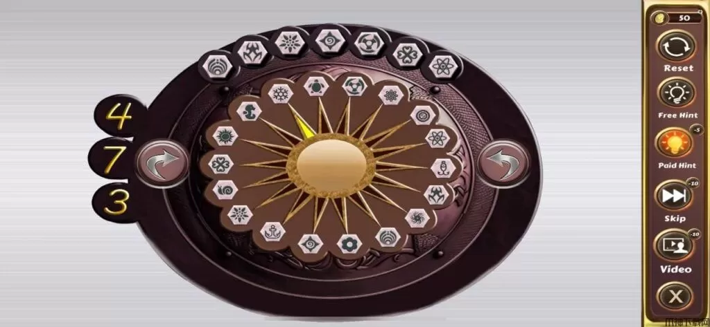 要完成这个谜题,玩家需要使用左右箭头将谜题顶部的七个符号匹配起来。左箭头顺时针移动,右箭头逆时针移动。3、7 或 4 表示在所选方向上跳过的格数。