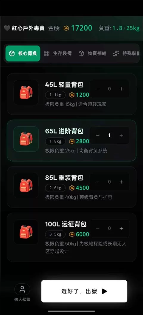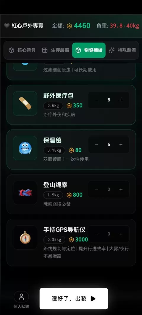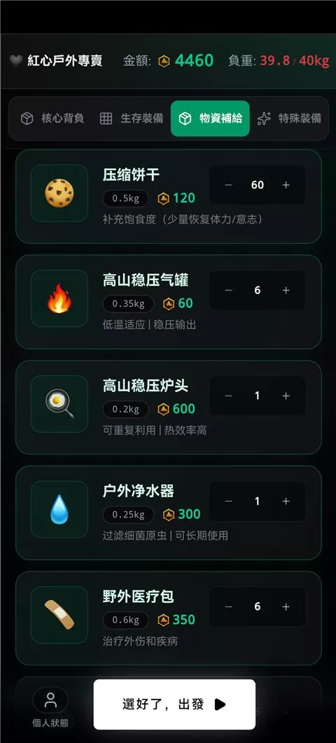 1、进入赛博徒步生死鳌太线官方版游戏中,首先在商店中购买装备和物资,选择好后就出发。