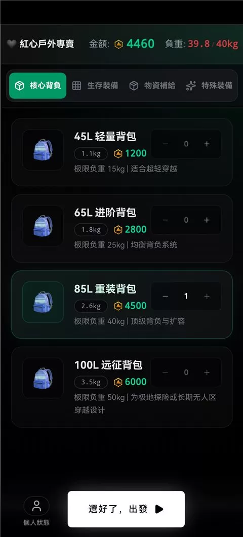 赛博徒步生死鳌太线是一款文字生存模拟手游,以鳌太线为背景,玩家将成为一位穿越鳌太线的徒步者,在极端天气与饥饿状态情况下寻找生路。玩家开局会获得一定预算与负重上限,需要前往商店购买背包、生存装备以及物资补给,在徒步过程中进行资源以及生命体征的管理,在资源消耗之前安全抵达终点或撤退。