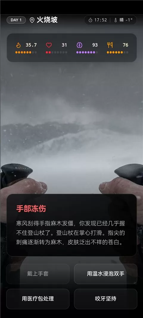 你需要同时管理角色的体温、体力、饱腹感等指标,任何一项失衡都可能导致失败。