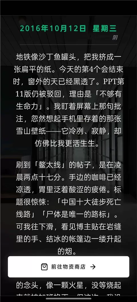 赛博徒步生死鳌太线是一款文字生存模拟手游,以鳌太线为背景,玩家将成为一位穿越鳌太线的徒步者,在极端天气与饥饿状态情况下寻找生路。