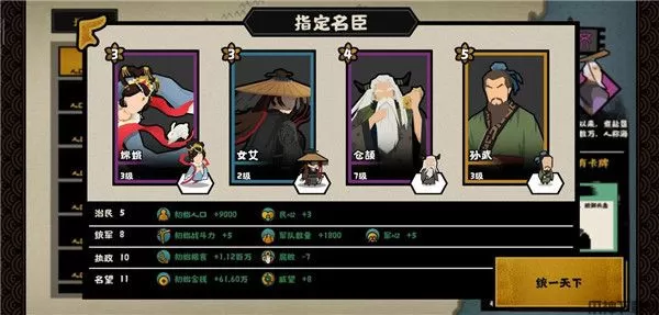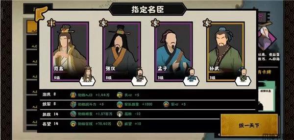 这一套搭配的名臣是扁鹊,商鞅,姜尚,白起,商鞅可以用张仪代替,这套搭配几乎有着无可匹敌的军事能力,前期就可以获得极高的