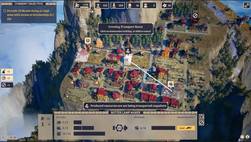 2、随着各个建筑的建立,玩家需要设立关键建筑物之间的关系,保证环环相扣,如食物收割存放进储粮库,随后运输之加工厂,随后进行成品加工,再进行出售等。