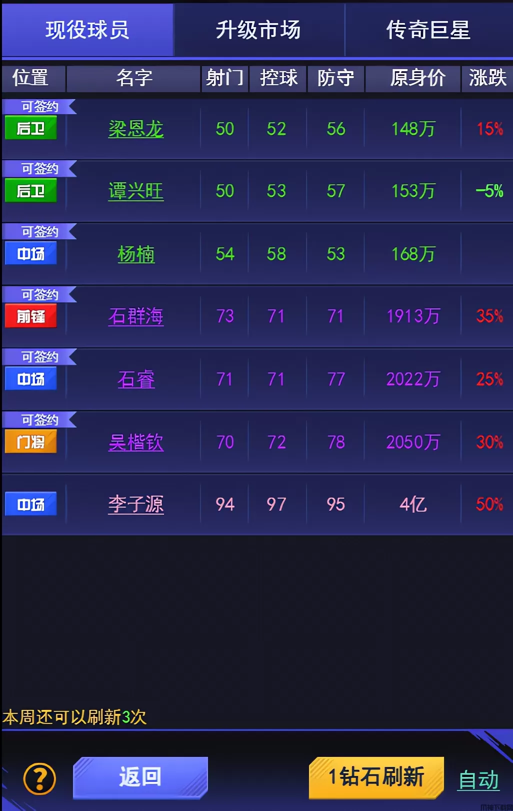3、刷新球员列表有次数限制,市场等级越高,可刷新次数越多;