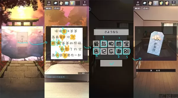 回到卧室,在桌面上取得手帕,打开后可发现上面有字;与幽灵对话得知“需要同时看正反两面”,前往后山将手帕泡水,显现出字。之后前往神社祈福,调整祈福为“彼岸花”,得到福纸。